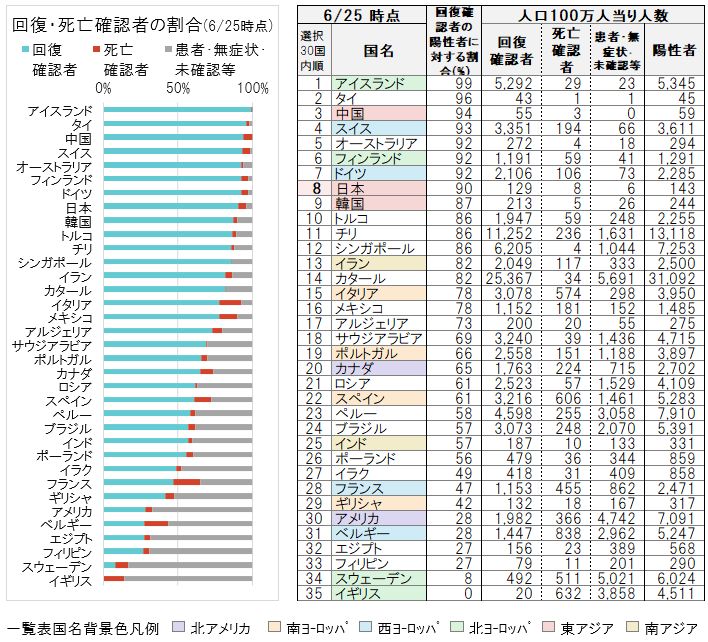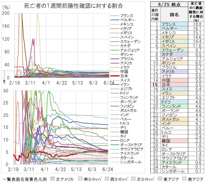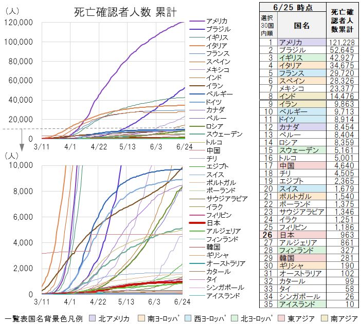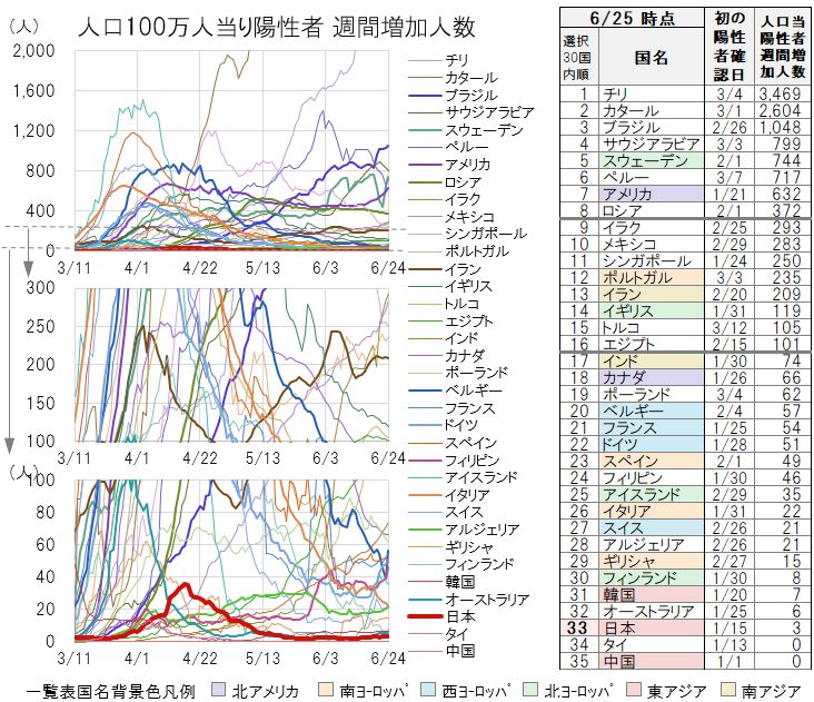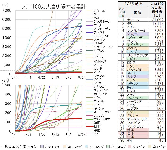 早い段階で急増した、中国、イラン、韓国等は一部欧米諸国よりは低いレベルで抑えられ、早期に対策開始したアジアやオセアニア諸国は、概ね抑えられてます。