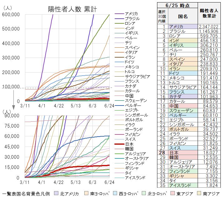 国別推移グラフ と 最新状況表(6/25 時点 選択国の増加傾向など)