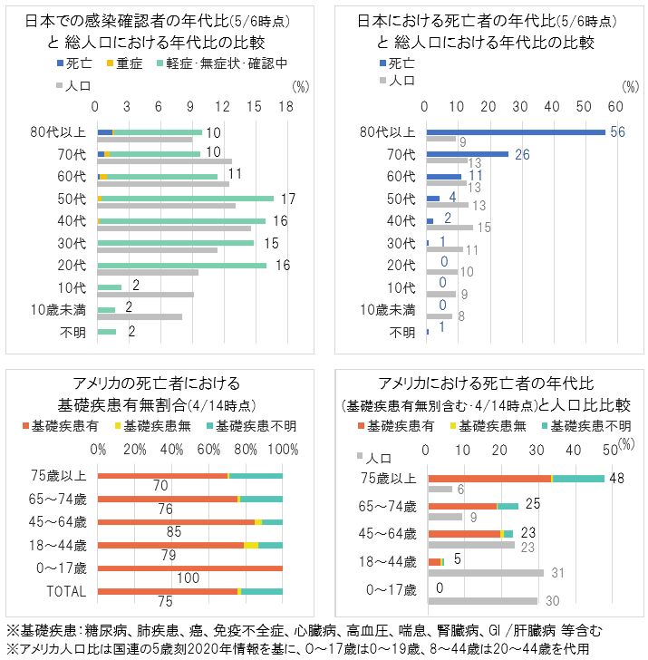 [出展]日本状況:東洋経済ONLINE、アメリカ状況:worldometer、人口比率:国連統計 2020年