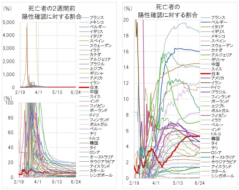 陽性確定から死亡2週間と想定した場合、日本は1週間前で設定した場合とほぼ変わらず5%前後でほぼ一定でしたが、多くの国で100%をはるかに超える(死亡者数が2週間前の陽性確定者数よりはるかに多い)状況がみられました。
