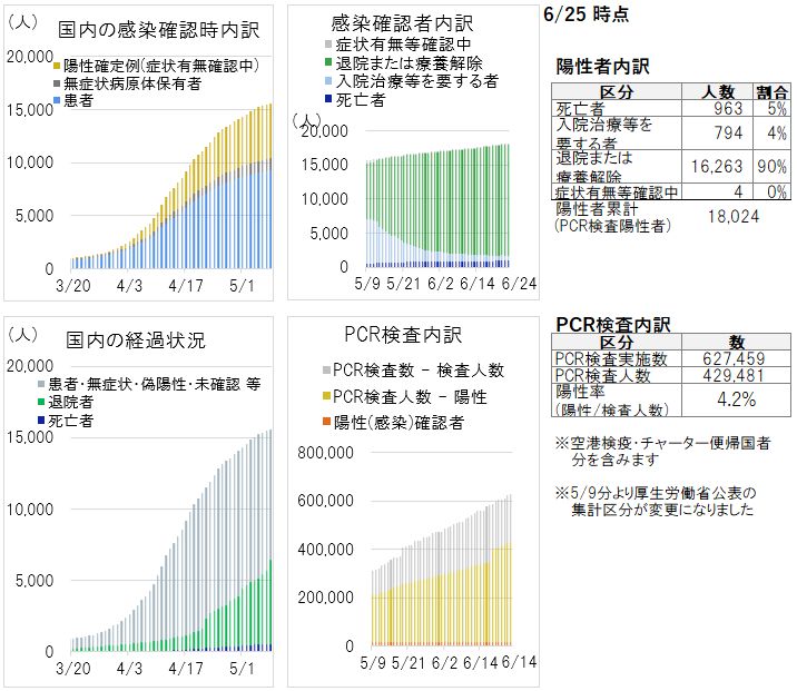 日本においては、陽性初確認は中国に次いで世界で2番目ですが、3月中旬になって増加傾向が強まり、4月上旬ごろより一部欧米諸国より低いレベルで増加傾向が抑えられてきており、5月中旬頃には増加傾向が強まった頃のペースにまでなりその後ほぼ横ばい。なお、新規週間でのグラフでは4/16頃がピークになっていますが実際はその1週間前頃より変化がみられています。